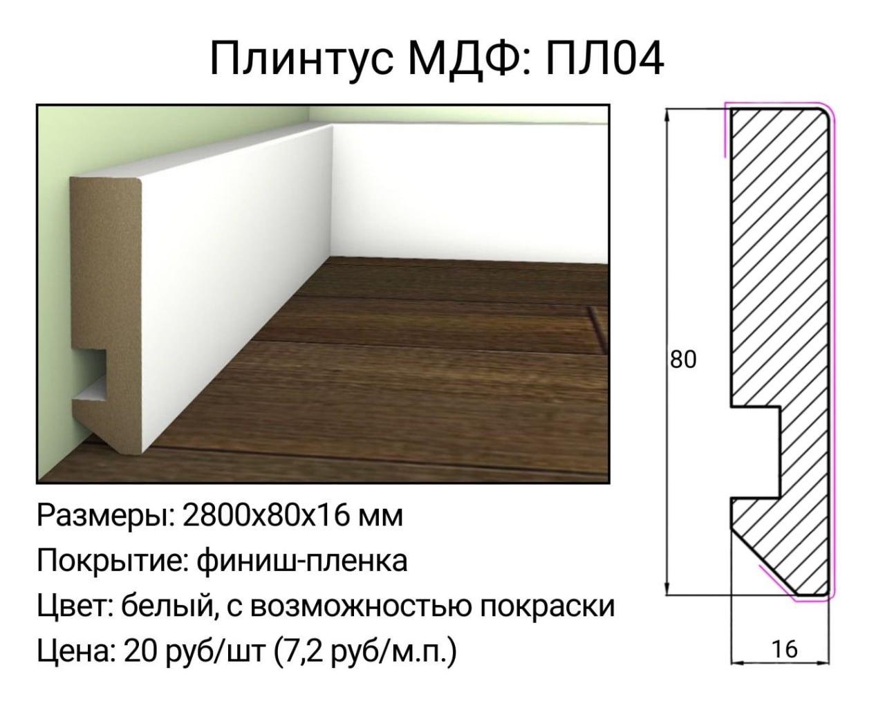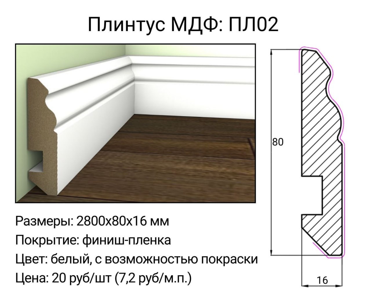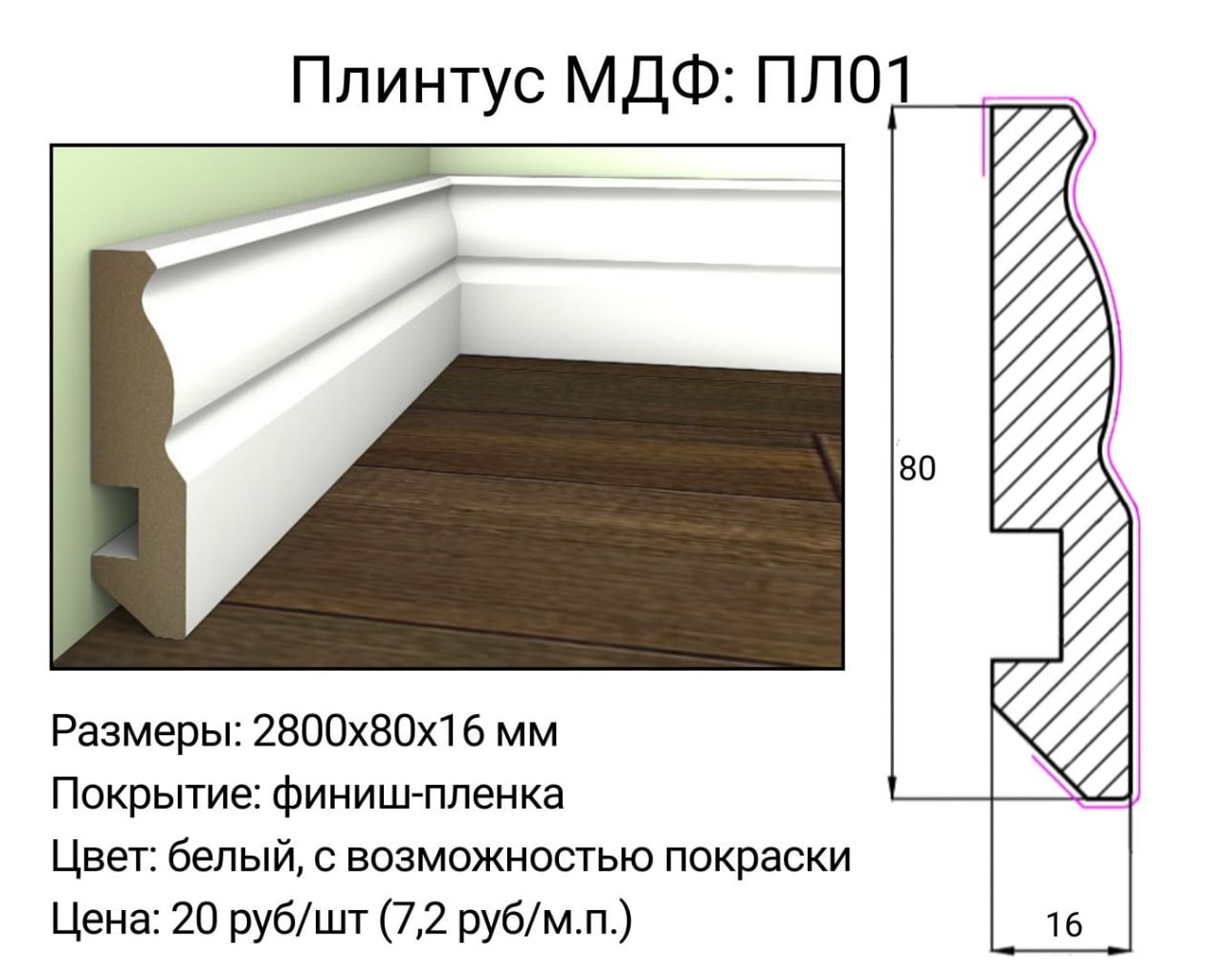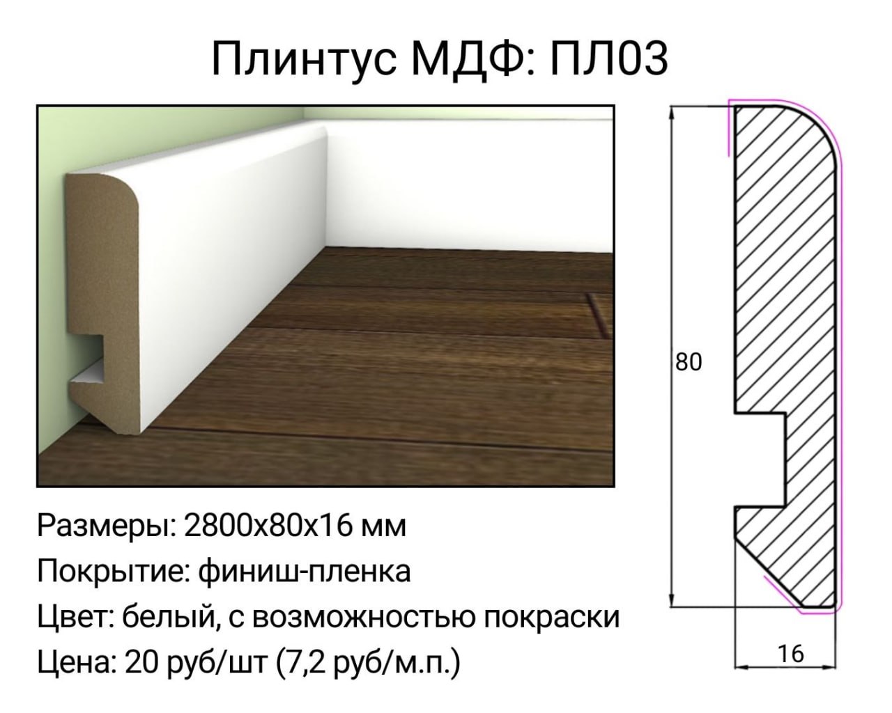 На странице размещена информация о плинтусе МДФ с фиксированными параметрами. Вы можете купить плинтус МДФ 80 мм в Минске, а также оформить заказ с доставкой по регионам. Также доступна возможность купить плинтус МДФ для объектов различного назначения (частный / коммерческий).