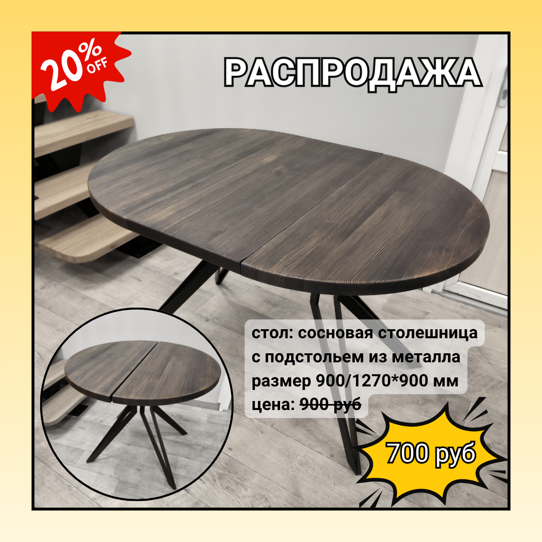 | 5 | сосна | раскладной стол из сосны | 900/1270 | 900 | 720 | 290 - столешница сосна | 380 - подстолье, 230 - механизм |